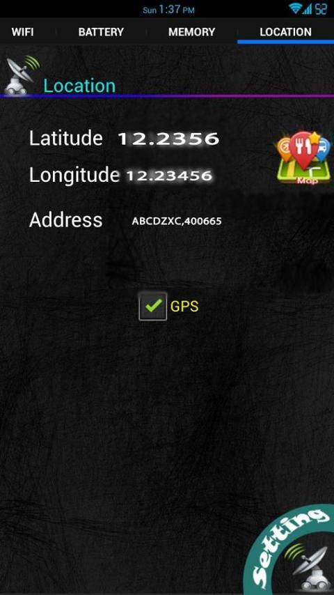 * Расположение: - Включите GPS ON / OFF. Это дает широту, долготу и ваш адрес. Это позволит вам перейти к Google Maps, которая дает ваше текущее местоположение. Вы можете открыть настройки местоположения напрямую.