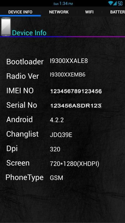 [Примечание: - Radio Ver. Требуется API 14 + и серийный номер Требуется API 9 + Если вы используете это приложение на любой API ниже этих спецификаций, то вы получите "-" или "Unknown" для соответствующей области]