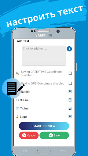 - Основные функции (фотографировать, записывать голос, речь в текст, дата / время и GPS-координаты)
