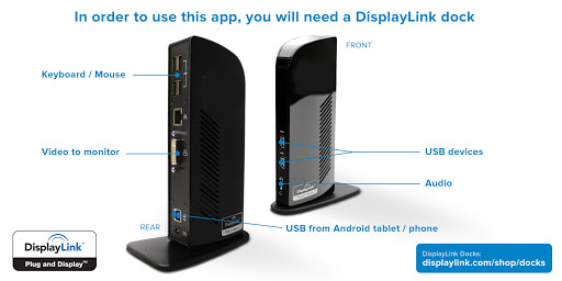 If used with a DisplayLink enabled docking station, larger monitors, keyboard and mouse can be connected to the Android device making it easier to interact with productivity apps.