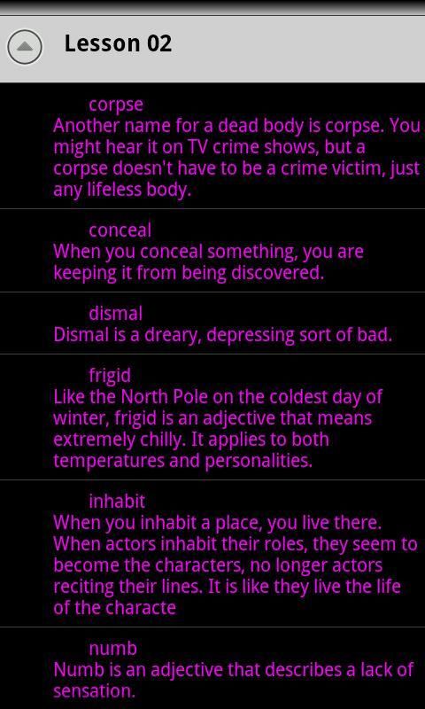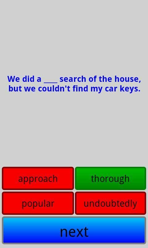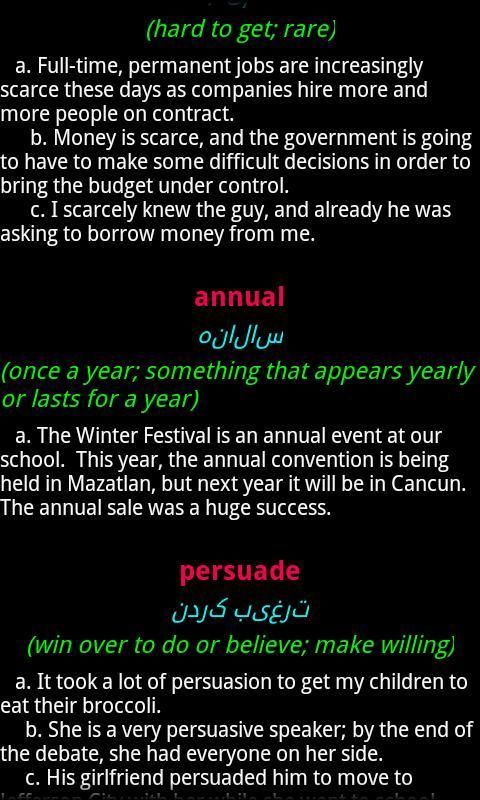 Это приложение словарь, который приходит на помощь тех, кто хочет пройти тесты, такие как IELTS, TOEFL или GRE. Он содержит 504 важных слов, которые сосредоточены в 42 уроков (на данный момент есть только 24 уроков в приложении, но мы прилагаем все усилия, чтобы сделать все 42 из них доступны в течение месяца или около того), каждый из которых содержит определения, примеры, упражнения и игры, которые сделают весь процесс обучения весело и легко. Существуют также тесты, которые будут проверять ход пользователей, поэтому обучение гарантировано.