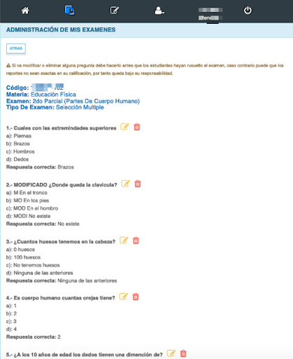 🔖 Las preguntas del examen se pueden modificar o eliminar sólo por el Docente que la creó.