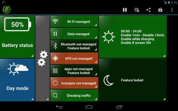 В отличие от других программ для экономии заряда батареи, которые требуют регулярных действий пользователя, GreenPower функционирует в полностью автоматическом режиме: после настройки, он работает и экономит заряд батареи самостоятельно. Делает он это просто за счет эффективного управления Wi-Fi, передачей данных, Bluetooth и яркостью экрана, выключая их когда они не нужны, но обеспечивая минимум неудобств при этом, и автоматически включая, когда это необходимо Вам или Вашим приложениям (например, почтовому клиенту). Самое простое, понятное и быстрое приложение в своей категории!