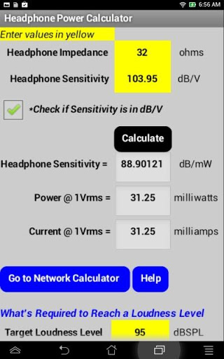 3. Для дополнительных сетевых расчетов введите свои чувствительность к наушнику в выходном напряжении DB / MW и усилителя и нажмите «рассчитать».