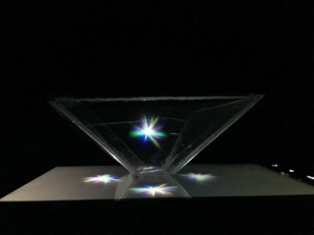 Голограмма просмотра 3D работает по принципу пирамиды, как он используется во многих коммерческих решений. Среди других на выставках и в витринах можно увидеть эффект голограммы с круговой обзор.