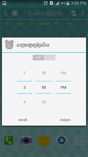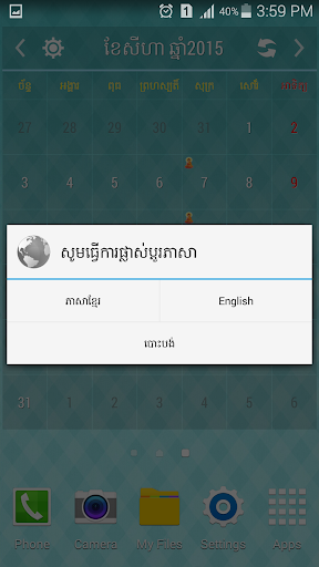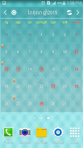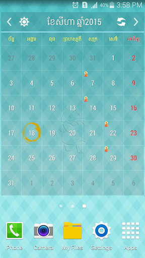 - Description of holiday and highlight - Change background color - Note - Notification on holy days - Two languages Khmer and English We share all together. Thanks for downloaded and rating.