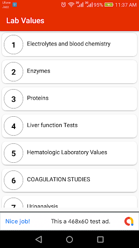 Lab Values and their interpretation, a nice android application. It is very easy to use. This application includes following topics.