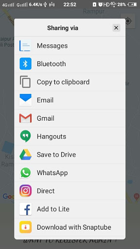 В этом приложении мы просто хотим сосредоточиться на одной проблеме, простое приложение для обмена местонахождением, не добавляет, без причудливых деталей, просто местоположение совместного использования в различных приложениях, таких как Gmail, Facebook, WhatsApp, Instagram, буфер обмена и т. Д.