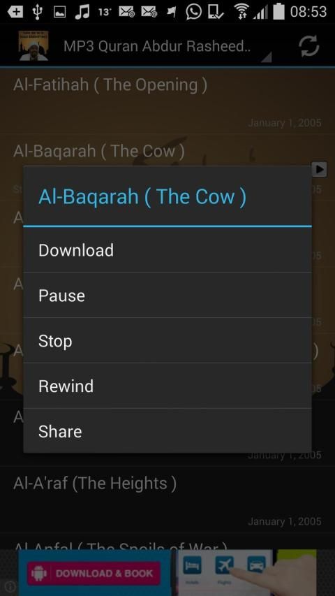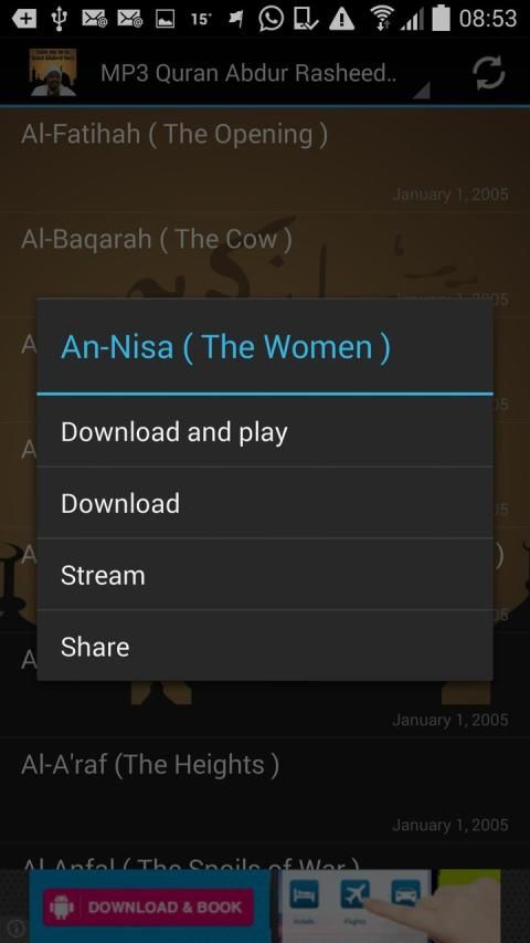 The Holy Quran Recitation of its entirety by Sheikh Abdur Rasheed Soofy This App contains the complete Qur'an Karim in High Quality MP3 audio by the famous Quran reciter Sheikh Abdul Rashid Ali Sufi You have the choice of either listening via audio streaming from the internet or you can download the files to your device. To download: select file, press long and see options. * All files are streamed from the internet (internet connection needed to listen!) * You can also download each MP3 file by using the download icon in the top right corner * If file is downloaded, the app will serve the audio file directly from your device (no internet connection needed) * Audio (streamed and downloaded) stops automatically when you receive a call To share audio files, press long, select share to see options. This is a FREE ad supported App, but without any annoying push ads! When you exit the app while an audio file is still active and playing, you can see a small music note in the notification bar. That is how you can get back to the app and either stop or change the station. App will not be listed in Task Manager. About the reciter: Abdul Rashid Ali Sufi is a Somali Qur’an reciter. He was born in 1964 to the reciter and preacher. Abd Rashid Ali Sufi first learnt the Qur’an at the mosque and finished memorizing it at the age of ten. He taught in Egypt, Qatar where he was nominated imam and preacher of the Anas Ibn Malik’s Mosque in Doha.