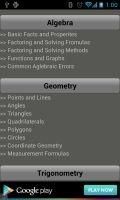 Math Formulas is one unique and comprehensive app that is particularly designed as a one-stop solution for College Grade/Higher Grade Students. It lists out all the important formulas/topics in Algebra, Geometry, Trigonometry and Calculus. Regular review of these formulas/concepts will definitely help improve your grades. The topics covered include: ALGEBRA Basic Properties and Facts Factoring and Solving Formulas Factoring and solving Methods (completing the squares methods etc...) Functions and Graphs Common Algebraic Errors GEOMETRY Points and Lines Angles Triangles Quadrilaterals Polygons Circles Coordinate Geometry Measurement Formulas TRIGONOMETRY Definitions Facts and Properties Formulas and Identities Unit Circle Inverse Trigonometric Functions Law of Sines, Cosines and Tangents CALCULUS Limits Derivatives Integrals Laplace Transforms