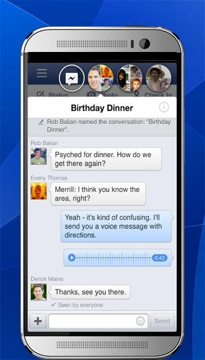 Применение Massenger имеет много преимуществ и разнообразие Пожалуй, наиболее заметные является то, что все пользователи нового приложения Facebook и Facebook Старого где вы можете получить доступ к Посланнику легко и быстро, как размер программы невелики и могут быть загружены на большинстве телефонов.