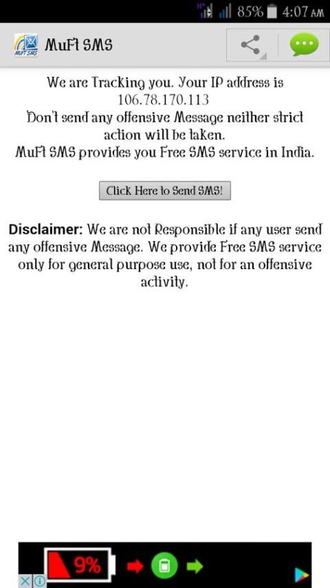 SMS является муфт оригинального App По ww.Muftsms.in, который предоставляет Вам бесплатную услугу SMS в Индии. С помощью SMS вы муфт может отправить сообщение 160 символов к вашим друзьям, семье или кому-либо, живущих в Индии. Его абсолютно бесплатный сервис для SMS. Так что наслаждайтесь и поделиться этим приложением с друзьями.