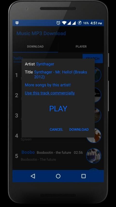 Приложение легко использовать все, что вам нужно сделать, это написать имя исполнителя, название альбома или песни, нажмите кнопку поиска. Песня появится на экране в течение нескольких секунд и может работать непосредственно внутри приложения, или загрузить на свой телефон.