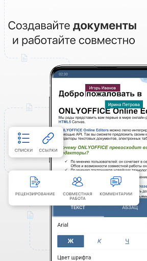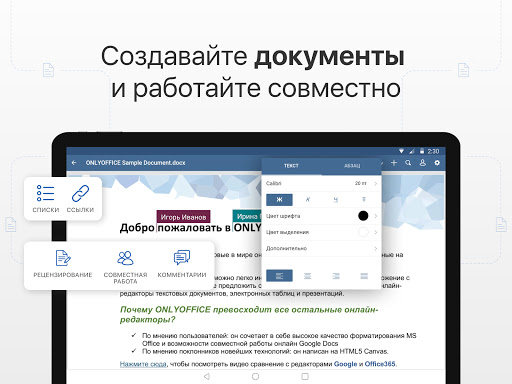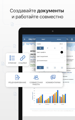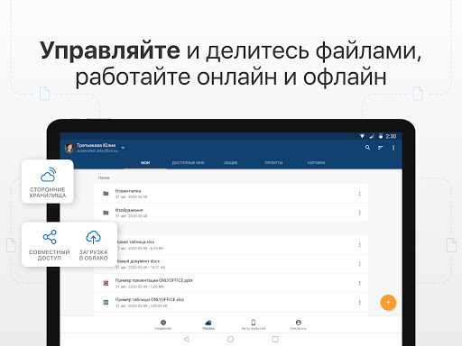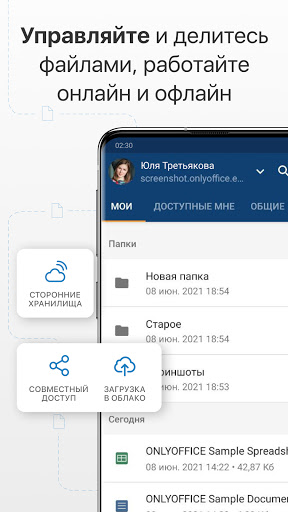 ONLYOFFICE Документы - это бесплатное приложение для работы с офисными документами. Работайте с файлами, которые хранятся в облаке ONLYOFFICE и других подключенных хранилищах. Редактируйте документы совместно. Просматривайте и редактируйте локальные файлы или получите доступ к сторонним облакам напрямую по WebDAV.