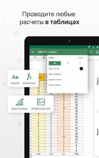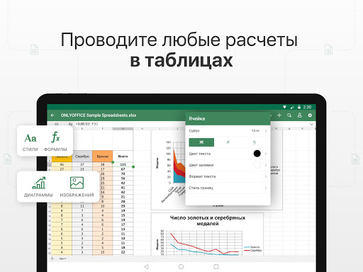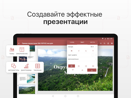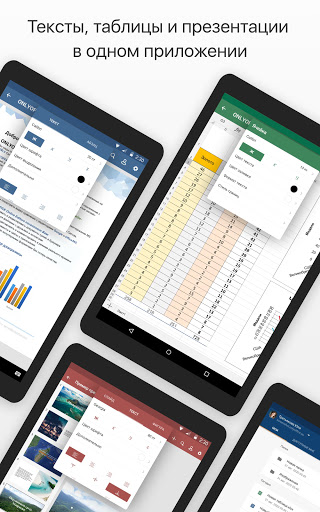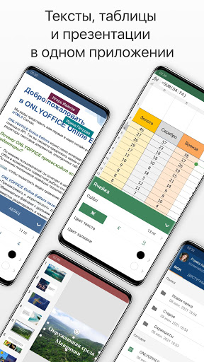 С помощью ONLYOFFICE вы можете просматривать, создавать и редактировать любые офисные документы - текстовые файлы, таблицы и презентации. Базовые форматы ONLYOFFICE - docx, xlsx, pptx. Другие популярные форматы (doc, xls, ppt, odt, ods, odp) также поддерживаются.