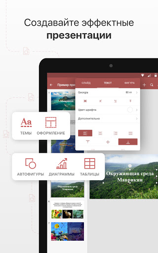 Редактируйте docx, pptx, xlsx, odt, odp, ods. Просматривайте pdf, презентации, изображения и видео. Сортируйте, переименовывайте, переносите и копируйте файлы, создавайте папки. Конвертируйте файлы в различные форматы.