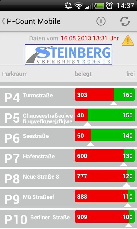 Приложение является универсальным, размещение данных из автостоянок и гаражей интерес как городского, так и местных парковочные системы сбора данных поддерживаются. Список систем парке приобретение, см. www.steinberg-traffic.com/p-count-mobile. Назначение дисплей легко читается, как красно-зелено-бар и численно.