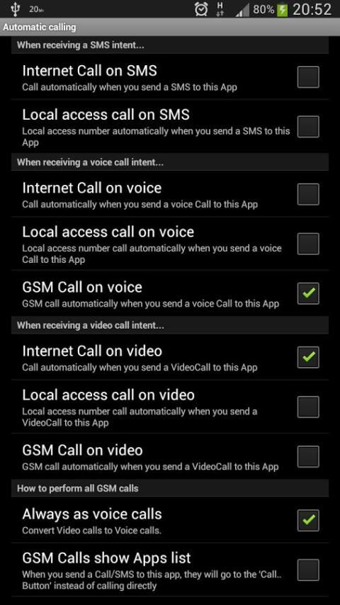 Вы также можете использовать это приложение, чтобы перенаправить намерения. Вперед дозвона намерения к Apps SMS и наоборот. Используйте, например, кнопку видеозвонка для вызова с использованием этого или любого другого приложения. У вас также есть 4 настраиваемых кнопок для ваших любимых приложений.