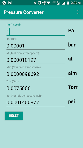 Convert between pressure units : Pascal , Bar , Technical Atmosphere (at) , Standard atmosphere (atm) , Torr , Pounds per square inch (psi)