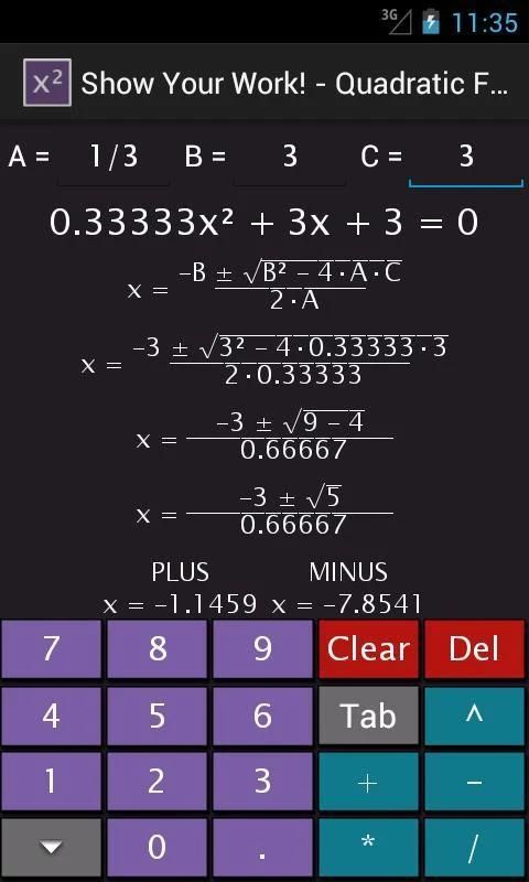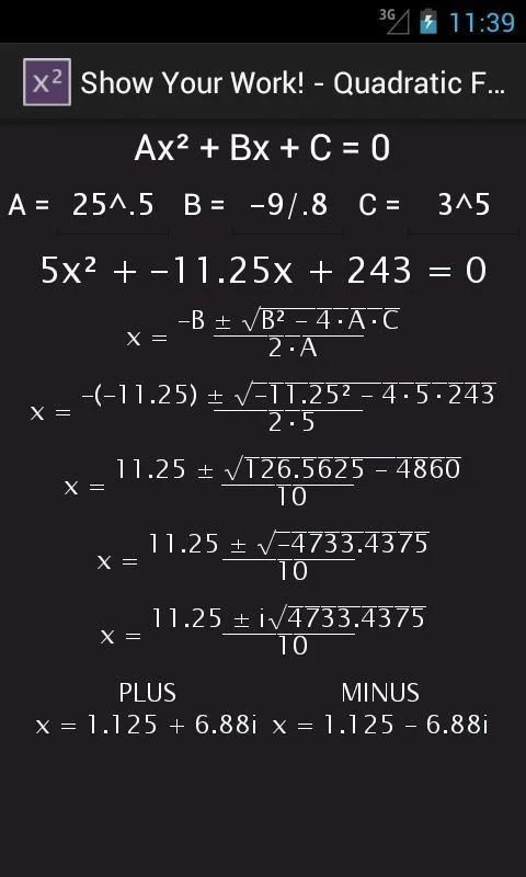 Это квадратное уравнение решатель, который показывает свою работу! Это дает учителю дружественный ответ и показывает работу каждый шаг на этом пути. Очень удобно для утомительных домашних заданий или просто для нахождения точных ответов быстро.