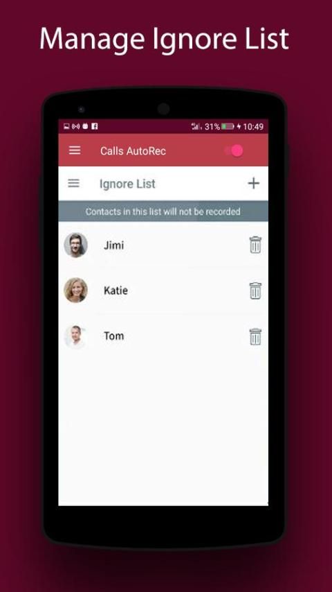 Игнорировать контакты - Этот параметр записывает все звонки с людьми, которые не являются контактами, контакты, за исключением предварительно отобранный для записи.