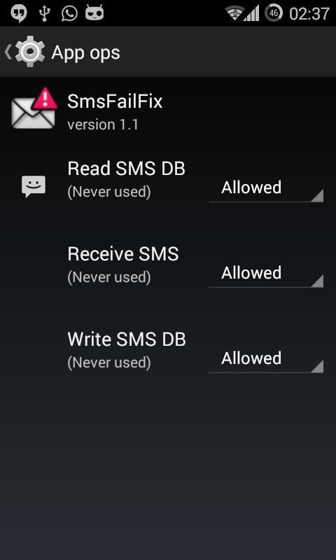 ПРИМЕЧАНИЕ: после недавних Android 4,4 релизы (например CyanogenMod 11) вы, возможно, придется пойти в Настройки -> Приватность -> Privacy Guard (или эквивалентные Ops App показывают) и нажать на несколько секунд на слот SMSFailFix в порядке, установленном "Написать SMS DB "до" животных "(как показано в третьем экрана). Это приложение не будет эффективным, если "Написать SMS DB" установлен на "Denied" (т.е. по умолчанию в CyanogenMod 11). После того "Написать SMS DB" вы можете запустить приложение только один раз, как если бы это был первый раз, когда вы запустите его после установки. Процедура, описанная в этом пункте, чтобы позволить "Написать SMS DB" занимает всего несколько секунд и она отлично работает на CyanogenMod 11. версии Android старше 4,4 не требуют эту процедуру.