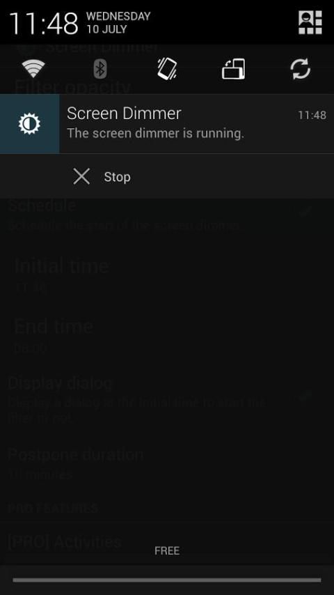 Enhanced notification : click on the brightness icon to stop Screen Dimmer or click on the progress bar to change the filter's opacity.
