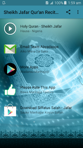 This application brings you complete Holy Quran mp3 voice of Sheik Jafar Mahmud Adam Nigeria. This app works without internet connection. Just download the app, install it and then at anytime you can listen to the recitation of the Holy Quran by the great Sheikh Jaafar Mahmud.