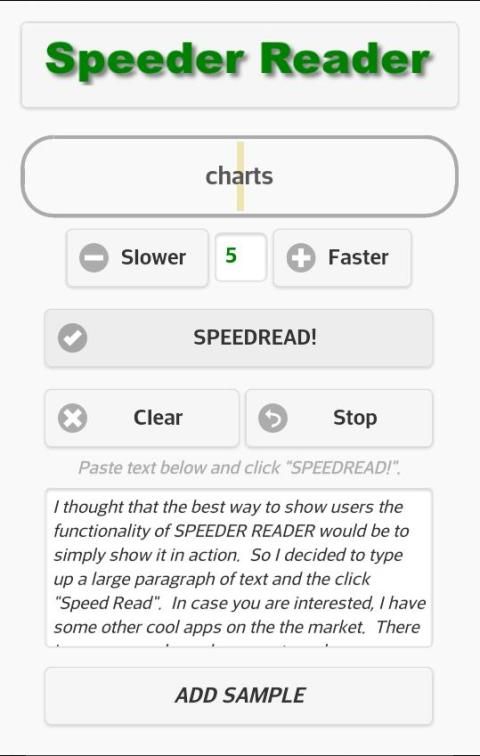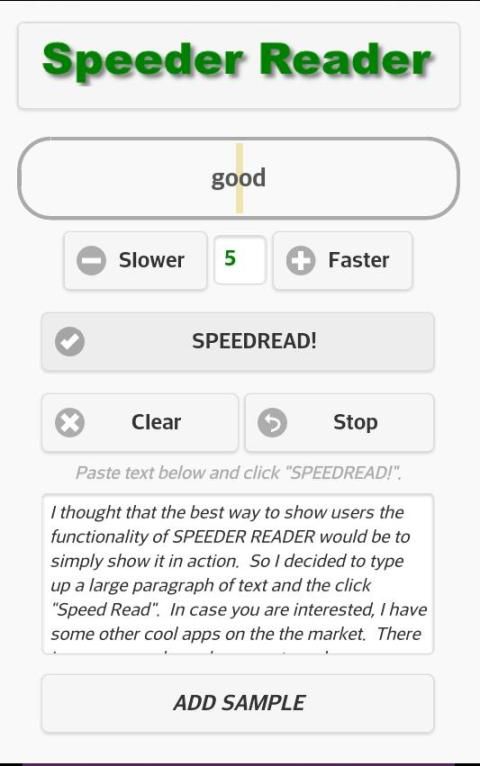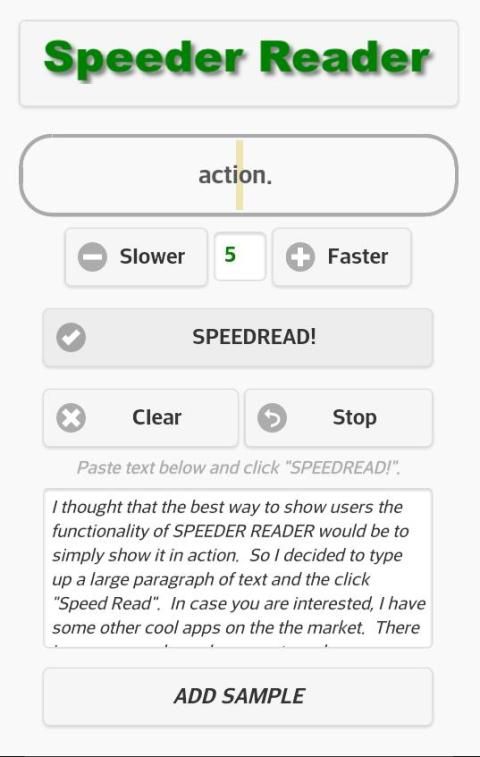 Простое приложение, чтобы вы скорость чтения одно слово за один раз, чтобы избежать отставание движении глаз и изменения линии. Просто вставьте в статье вы хотите SpeedRead, выбрать скорость чтения, и вперед!