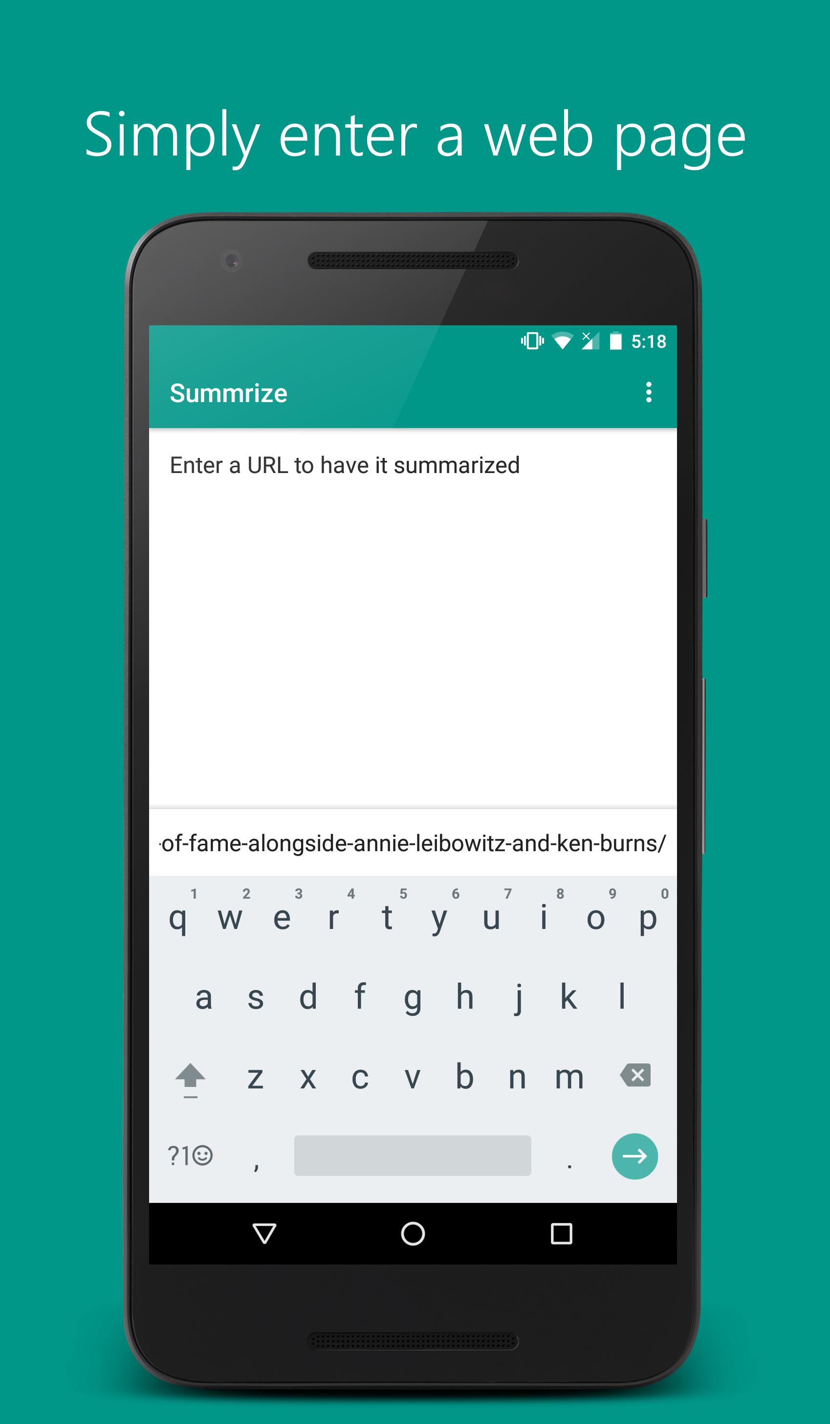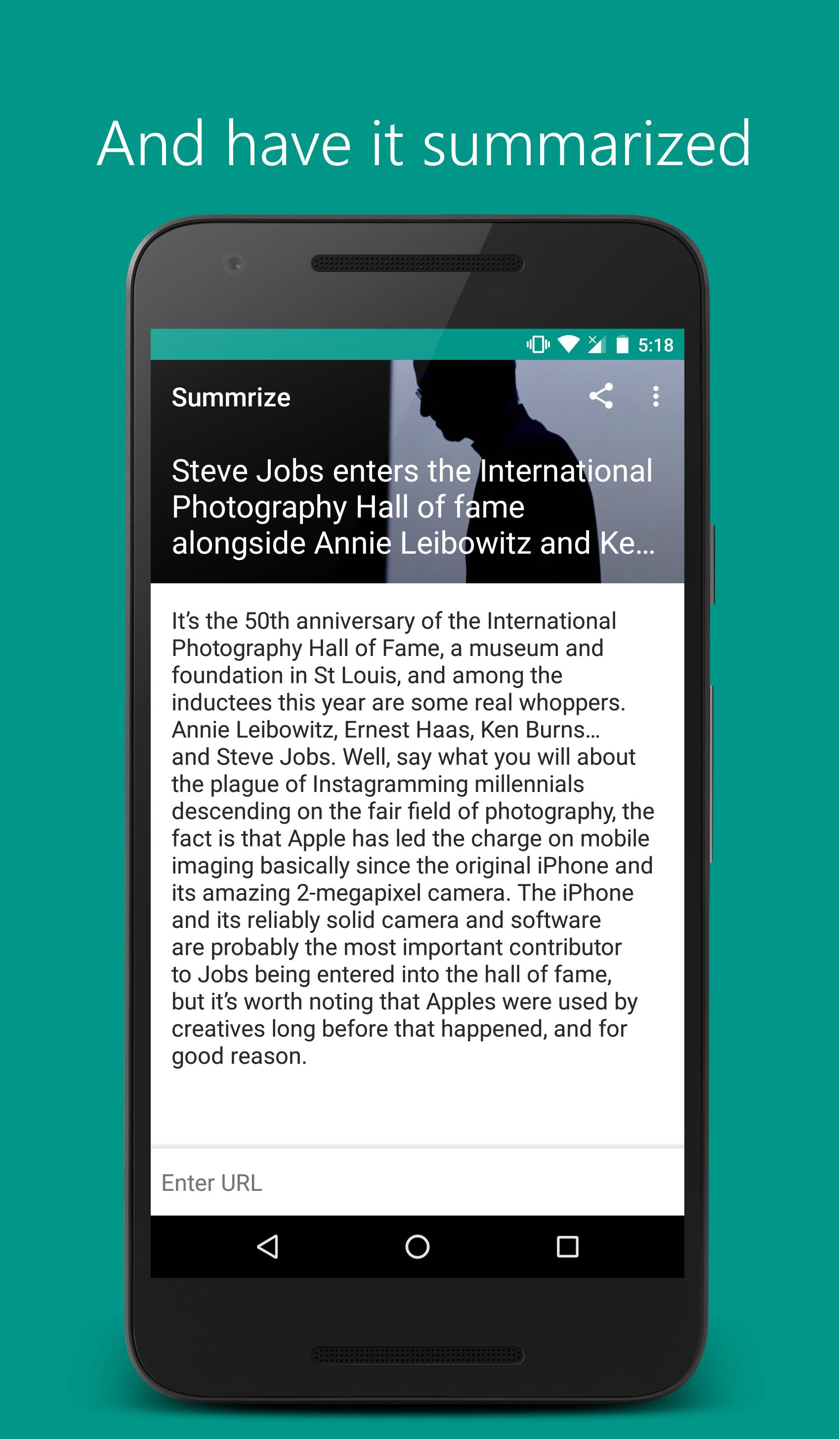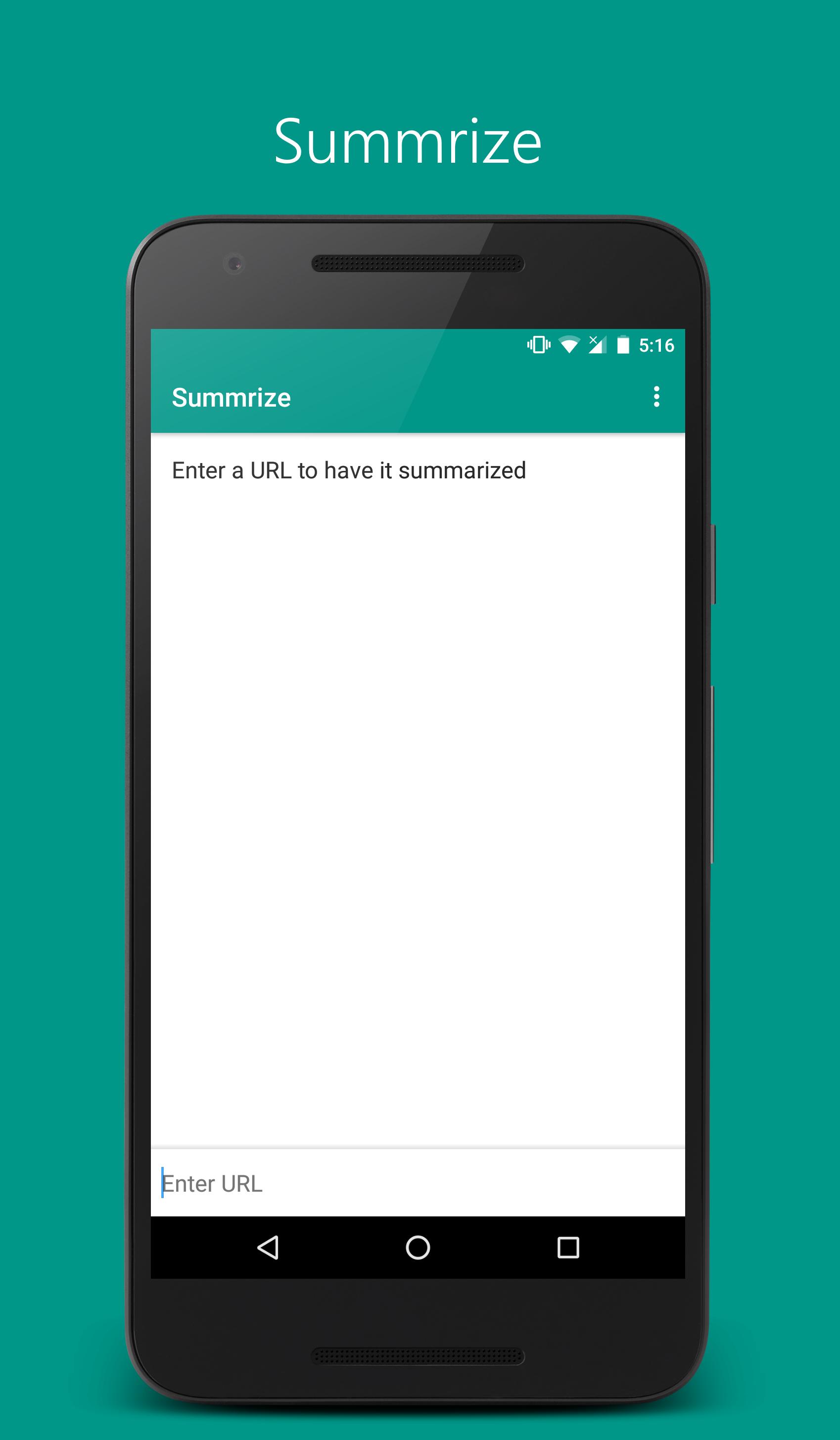 Summrize shortens your reading time by summarizing web articles into 4 sentences. Simply enter the URL or share the web page into the app and let Summrize do the rest by returning a 4 sentence summary for you to read. It summarizes the article by picking the top 4 most informative sentences and displaying the summary to you. Use this app to get the main points or gist of a blog or news post to quicken your decision making and shorten your reading time.