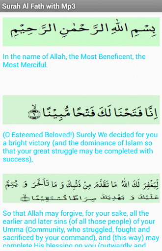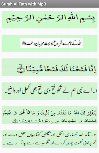 and written text of Surah ad Fath along with the translation /tarjuma – available in both English and Urdu.