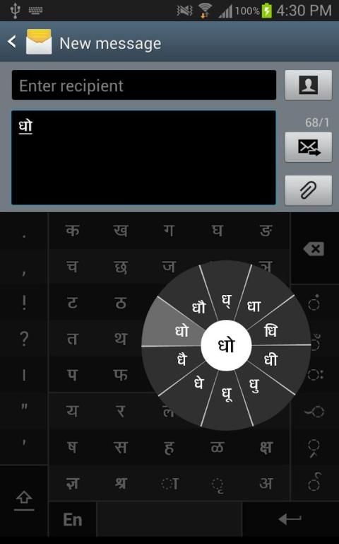 гласные (अ, आ, इ, ई, उ, ऊ, ए, ऐ, ओ, औ) появляются в отдельном чакры в правом нижнем углу. Менее используемые гласные и Матрас находятся рядом с ней (, ऑ, ृ, ऋ, ॄ, ॠ, ॆ, ॊ, ॅ, ॉ,). Цифры, символы и редко используемые символы отображаются на смену. Кроме того, можно переключиться на клавиатуре QWERTY временно вводить английскими символами.