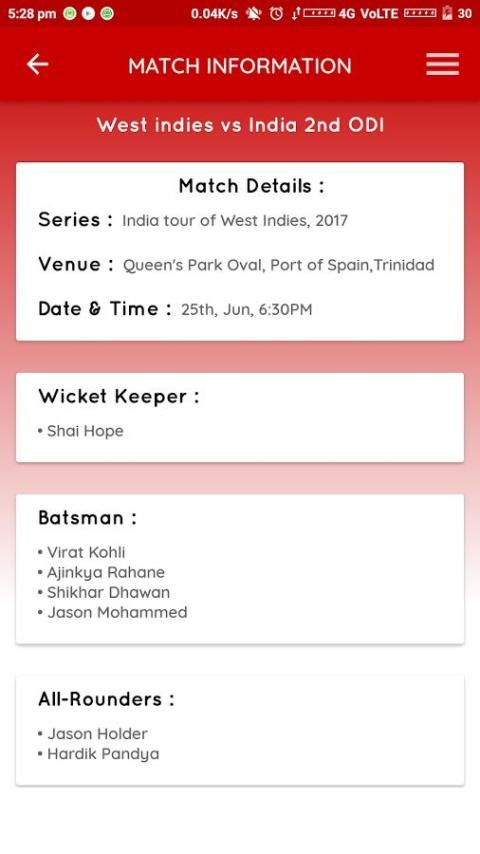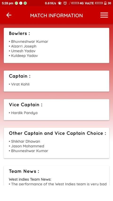 Информация, предоставленная приложением на основе различных факторов, как предыдущая игра команды, состояние тангажа, место проведения матча и т.д.
