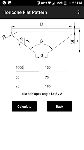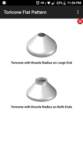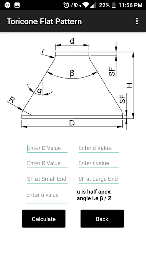 Toricone Flat Pattern app developed to get layout or flat pattern of Toricone with knuckle at large end or Knuckle at Both Ends in easy & faster. this app is very useful for engineers working in the field of fabrication of Pressure Vessel, heat Ex changer, Storage Tank, Agitator or mixer and any other process equipment manufacturing Industry. this app is very simple to use & learn.