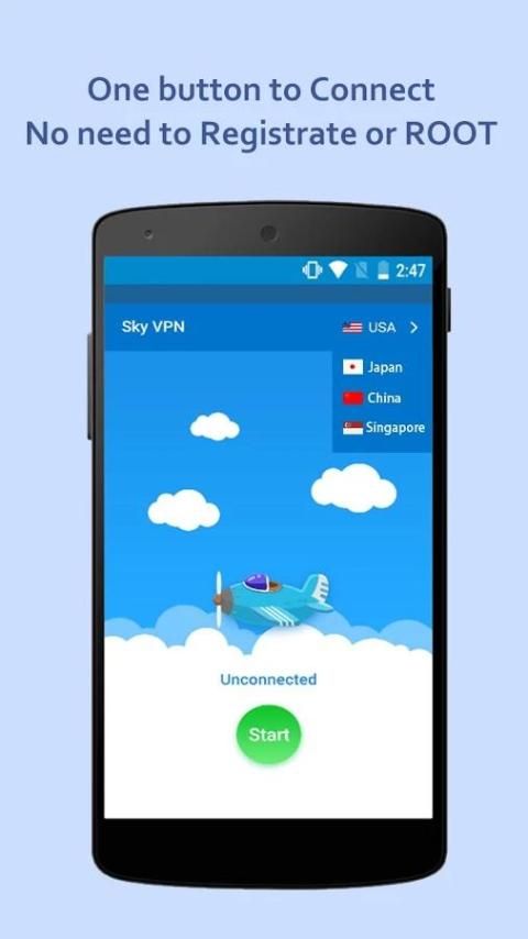 Нет необходимости регистрироваться или корневые устройства. Просто нажмите кнопку подключения, а затем получить доступ к социальным сетям и другим заблокированным веб-сайты из любой точки мира.