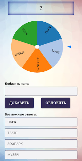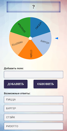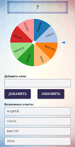 Каждый поворот колеса - произвольный выбор. Вы можете использовать колесо удачи, чтобы ответить да или нет, выбрать победителя, принять решение и т.д. Если вам не хватает полей, добавьте любое количество из них ниже. Вы также можете отредактировать существующие поля.