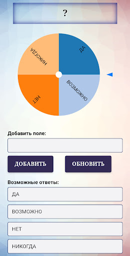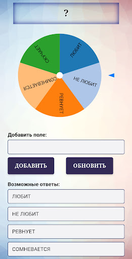 Вы можете создать свое исключительное гадание с помощью колеса фортуны. Вы можете создать простое гадание из двух ответов «любит не любит», или более сложное гадание с множеством ответов. Используйте это колесо фортуны творчески. Например, решить что надеть, куда пойти сегодня и т.д. Есть много вариантов использования колеса фортуны. Здесь главное ваше воображение.