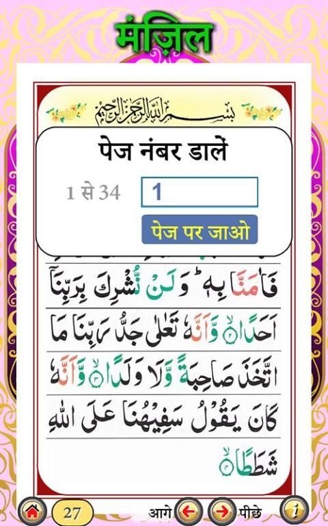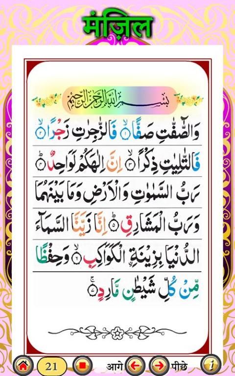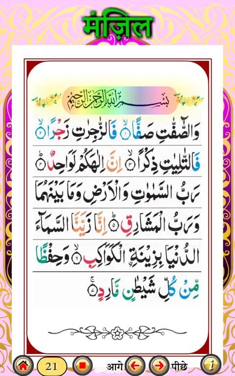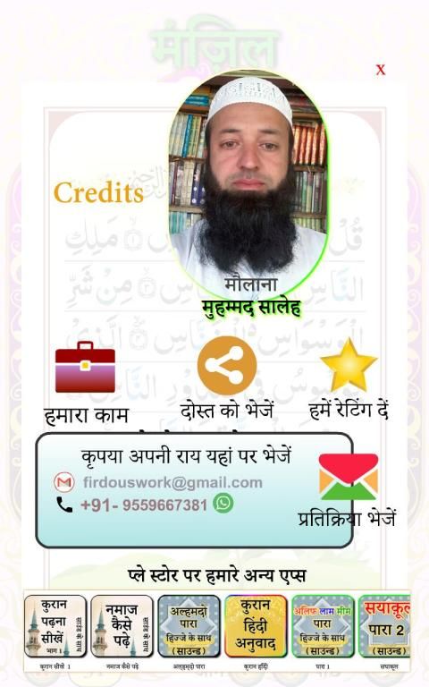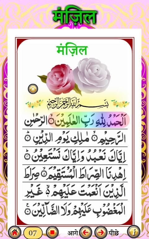 मंजिल- कुरान से आयत और लघु सूरह का संग्रह है जिसे ब्लैक मैजिक, जिन्न, जादू, बुरी निगाह के साथ-साथ अन्य हानिकारक चीजों से सुरक्षा और प्रतिरक्षा के साधन के रूप में पढ़ा जाता है। इसमें मोहम्मद सालेह द्वारा ऑडियो पठन शामिल है।