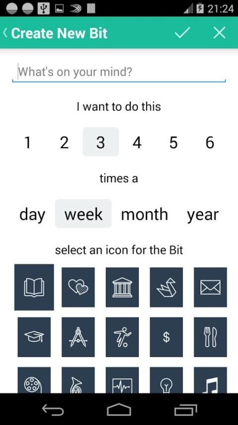 Биты мне очень помогает в управлении свое время в более здоровой и продуктивной Кстати, я надеюсь, что это делает то же самое для вас! Если вы обнаружите какие-либо ошибки (это бета-версия, так что вы, конечно, будет: P) или у вас есть предложения, просто сказать "привет" на android.bitsapp @ gmail.com.