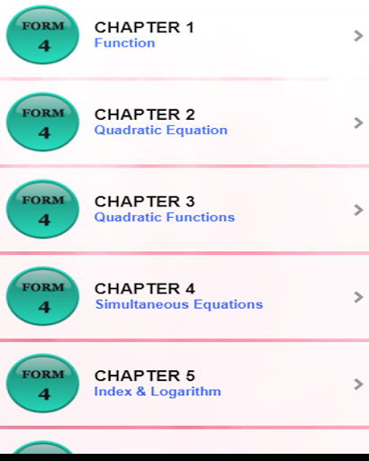 This free app provides a quick reference or guide to all SPM Additional Mathematics topics covered in Form 4 and Form 5. There are 9 chapters in Form 4 and 10 chapters in Form 5.