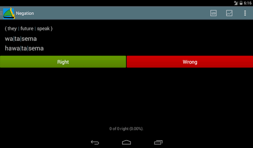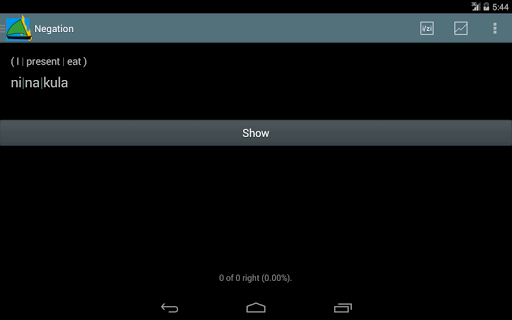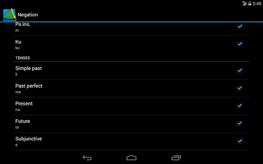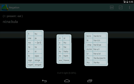 • for each area, each class and case can individually be enabled or disabled; i.e. you may only practice negation for m/wa class in tenses li/me/na/ta