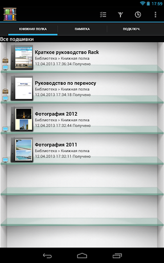 Данные подшивки можно также импортировать в Rack2-Filer Smart for Android с помощью облачных приложений (SugarSync, Dropbox).