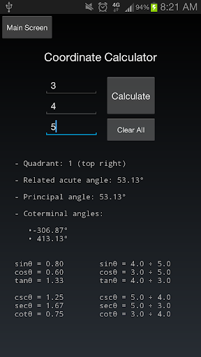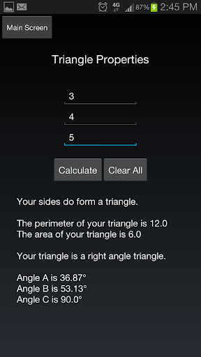 • Triangle Properties (enter side lengths of any triangle; returns angles, area, perimeter, etc.)