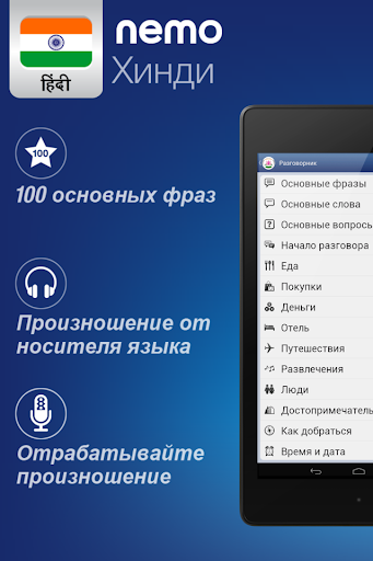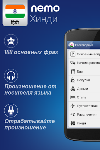 Начните учить то, что хотите вы в удобное для вас время. Разговорник предлагает быстрый доступ к хинди-русскому словарю в приложении через интерфейс словаря. Nemo также выполняет функции переводчика. Найдите нужные вам слова с помощью функции поиска и воспроизведите звук через динамик устройства.