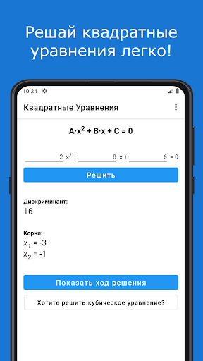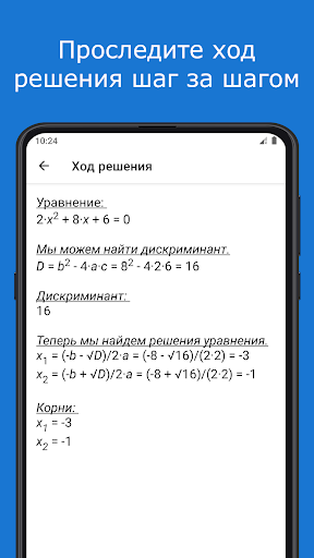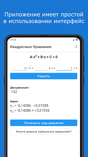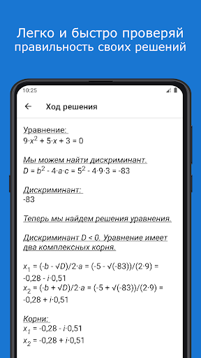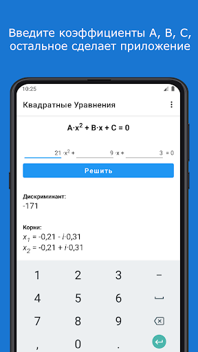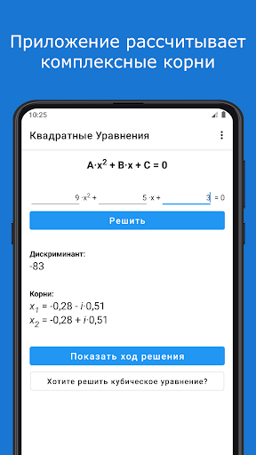 Если уравнение не имеет действительные корни, приложение рассчитает комплексные корни.