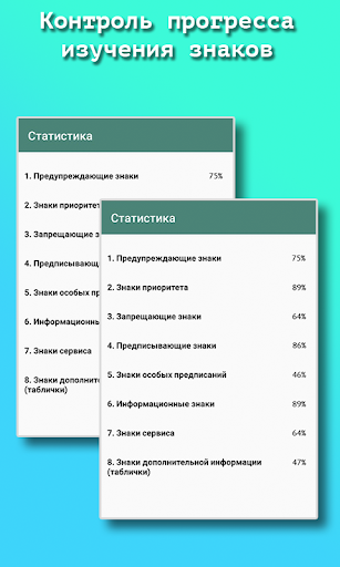 изменения и дополнения Правил Дорожного Движения РФ актуальные на 2020 год. Раздел Тренажер состоит из тестов, что помогает проверить знания дорожных знаков. Прогресс изучения знаков сохраняется в разделе Статистика.