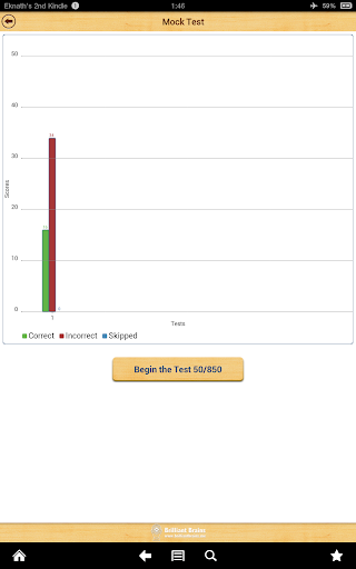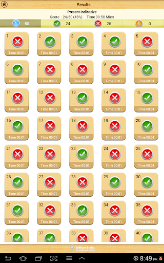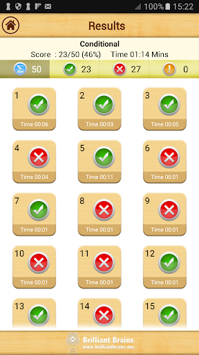 A summary of the practice test is presented at the end of each test. It shows you the time you took, the score, which questions you answered correctly and where you were wrong. Review each question with explanation.