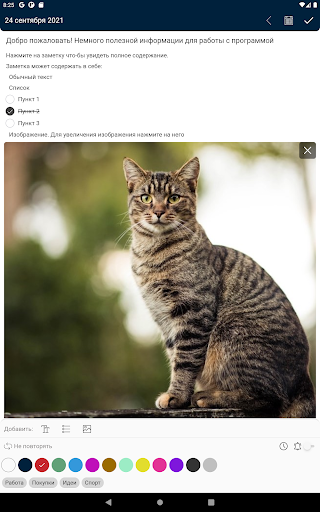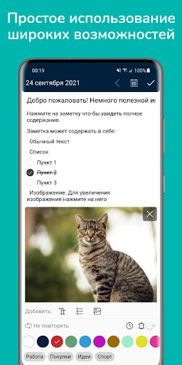 Умное содержание - пункты списка можно отметить как завершенный. Быстрые действия по клику на телефон, email, url-адрес. Содержание можно выделять как обычный текст с возможностью последующего копирования.
