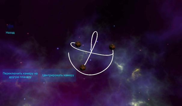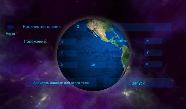 Инструкция в разделе приложения слишком подробнейшая ( на сайте разработчика)... Если коротко - вводим количество планет, затем для каждой прописываем 7 параметров (координаты x,y,z, cкорость x,y,z и массу тела). Сохраняем данные для каждой планеты! Всё ввели - жмем "запуск".