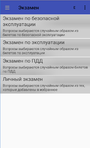 Приложение является помощником в подготовке к сдаче экзамена в ГосТехНадзоре для самоходных машин категорий E и F.